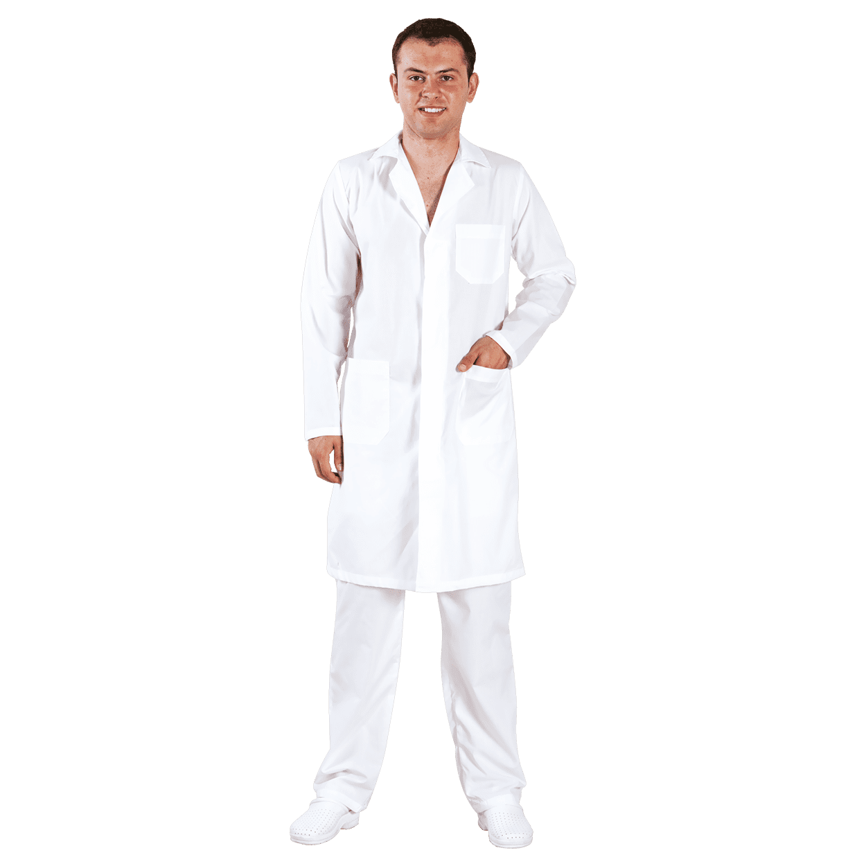 Ανδρική ποδιά με γιακά και πέτο, μακριά μανίκια, τρεις τσέπες και κούμπωμα με κουμπιά.