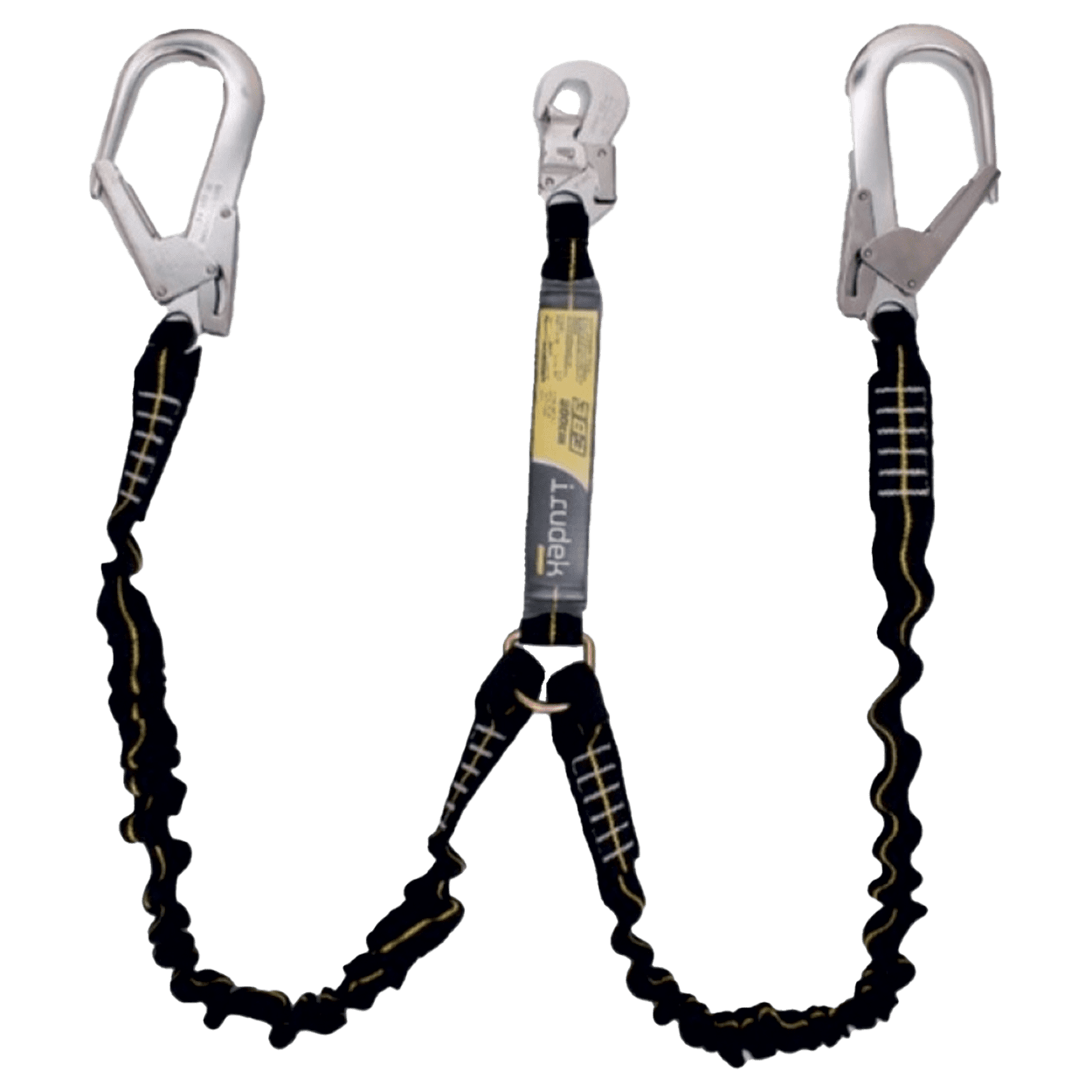 Διπλός ελαστικός ιμάντας με απορροφητή ενέργειας + ένα αυτόματο ατσάλινο καραμπίνερ + δύο καραμπίνερ αλουμινίου με οπή 60 mm. ΥΛΙΚΟ: πολυεστέρας, χάλυβας, αλουμίνιο